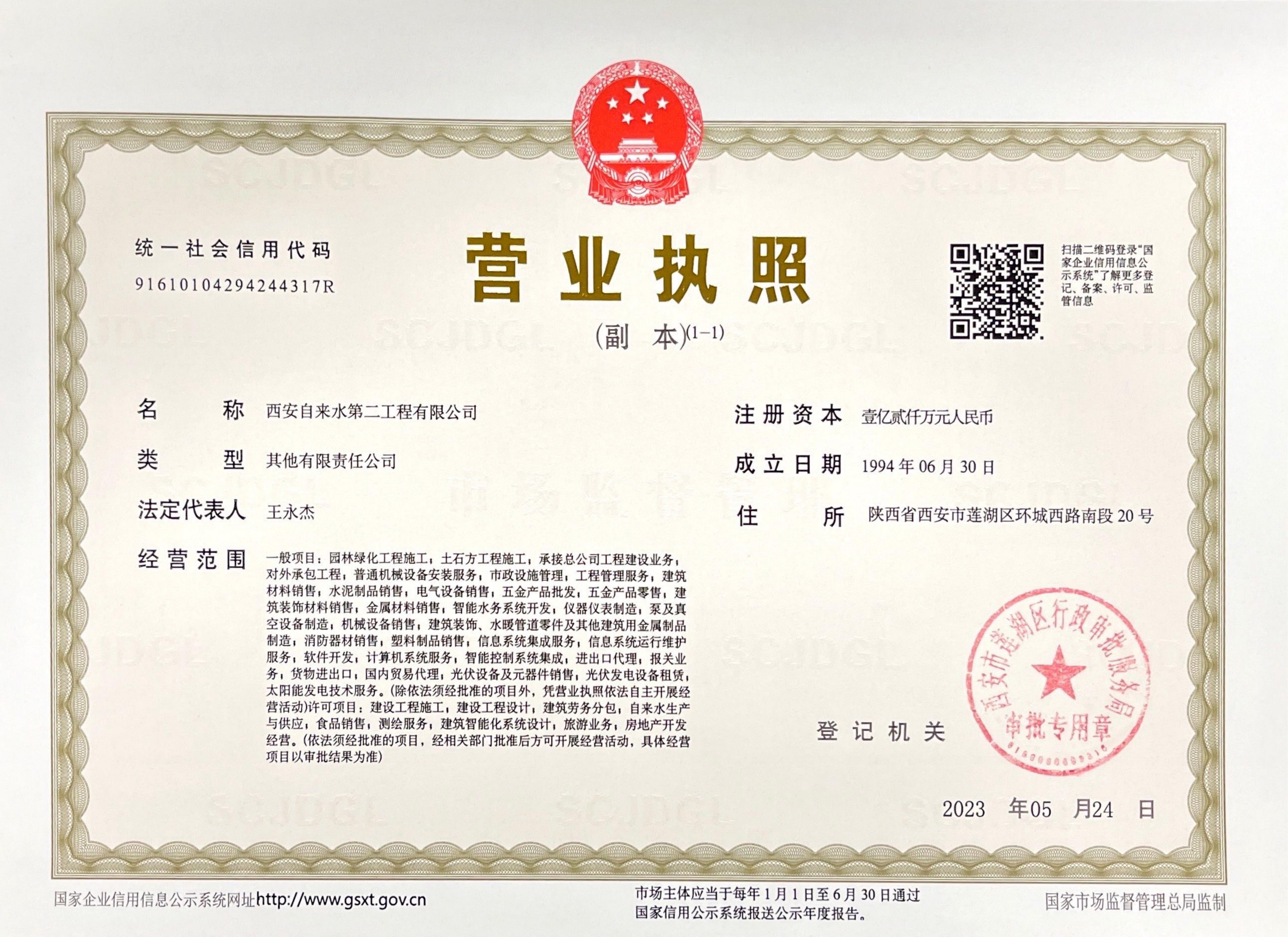 西安自來水第二工程有限公司是西安供水集團下屬的獨立法人單位。公司成立于1994年,注冊資金壹億貳仟萬元。現有員工180余人,其中具有一級、二級注冊建造師30余人,中、高級職稱人員70余人。經營范圍:一般項目:園林綠化工程施工;土石方工程施工;承接總公司工程建設業務;對外承包工程;普通機械設備安裝服務;市政設施管理;工程管理服務;建筑材料銷售:水泥制品銷售;電氣設備銷售;五金產品批發;五金產品零售;建筑裝飾材料銷售;金屬材料銷售;智能水務系統開發;儀器儀表制造;泵及真空設備制造;機械設備銷售;建筑裝飾、水暖管道零件及其他建筑用金屬制品制造;消防器材銷售;塑料制品銷售;信息系統集成服務;信息系統運行維護服務;軟件開發;計算機系統服務;智能控制系統集成;進出口代理;報關業務;貨物進出口;國內貿易代理;光伏設備及元器件銷售;光伏發電設備租賃;太陽能發電技術服務。許可項目:建設工程施工;建設工程設計;建筑勞務分包;自來水生產與供應;食品銷售;測繪服務;建筑智能化系統設計;旅游業務;房地產開發經營。